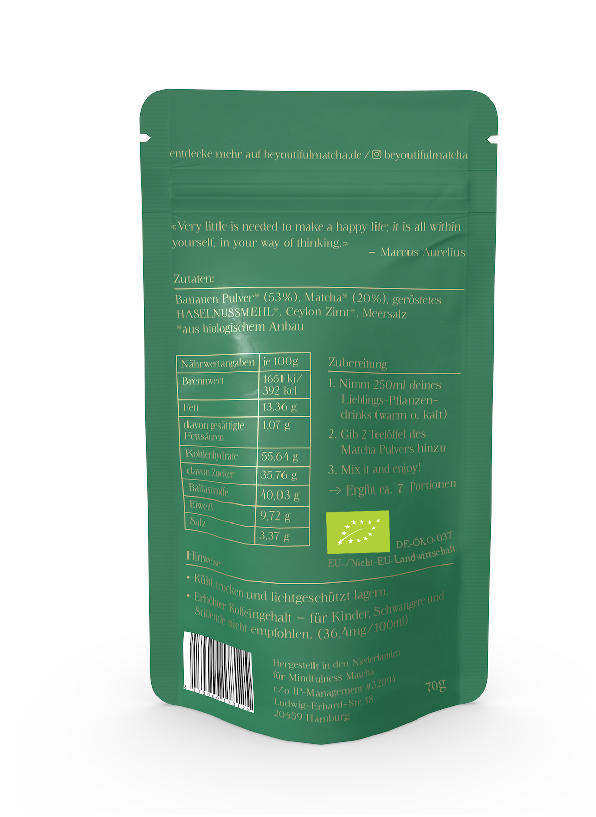 Bananen Pulver* (53%), Matcha* (20%), geröstetes HASELNUSSMEHL*, Ceylon Zimt*, Meersalz
